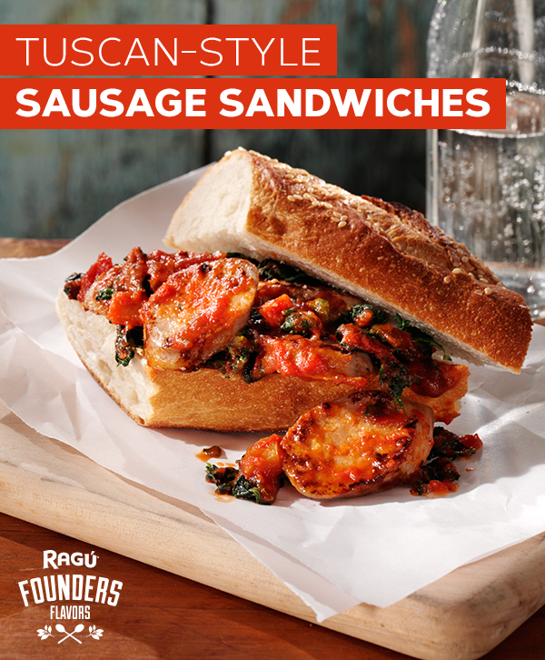 Tuscan-Style Sausage Sandwiches Prep Time: 15 minutes Cook Time: 15 minutes Servings: 4 Share: PRINT EMAIL PDF Pinterest This Recipe Calls For Old World Style® Sauces Traditional Sauce Shop Now RAGÚ Simply Sauces Traditional Pasta Sauce Shop Now Kettle Cooked Sauces RAGÚ® Kettle Cooked Marinara Pasta Sauce Shop Now Previous Next Ingredients 1 lb. hot Italian sausage links or sweet Italian sausage links, sliced 1 small onion, sliced 1 box (10 oz.) frozen chopped spinach, thawed and squeezed dry 1/2 cup sliced fresh mushrooms or drained canned sliced mushrooms 1 jar RAGÚ® Old World Style® Traditional Sauce 1 loaf (16 in.) Italian bread or French bread, cut into 4 pieces Instructions In large nonstick skillet, brown sausage over medium-high heat. Stir in onion, spinach and mushrooms. Cook, stirring occasionally, 5 minutes or until sausage is done. Stir in sauce; heat through. For each sandwich, split open each bread piece, and evenly spoon in sausage mixture. Sprinkle, if desired, with crushed red pepper flakes.
