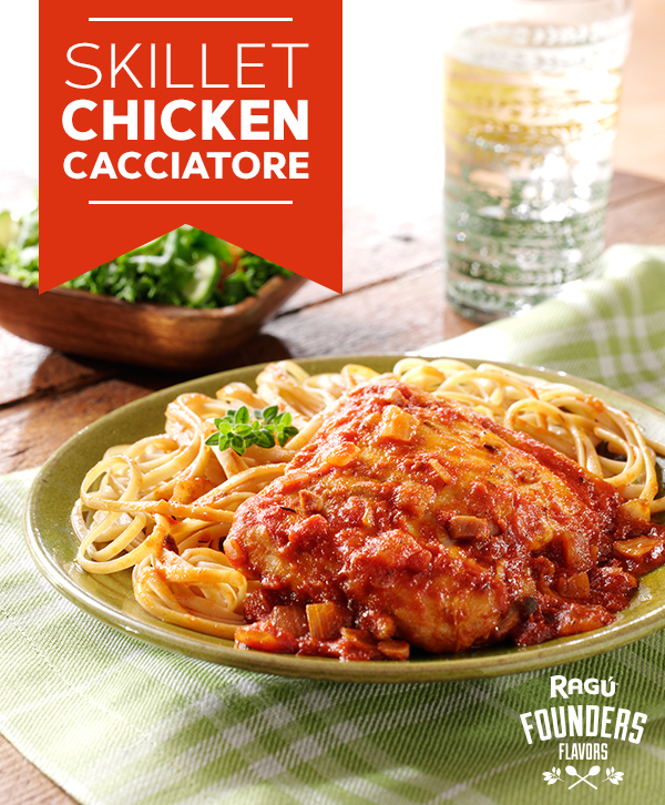 Skillet Chicken Cacciatore Prep Time: 5 minutes Cook Time: 25 minutes Servings: 6 Share: PRINT EMAIL PDF Pinterest This Recipe Calls For Old World Style® Sauces Traditional Sauce Shop Now Ingredients 2 Tbsp. olive oil, divided 1 1/2 lbs. boneless, skinless chicken thighs 1 large onion chopped 1 jar RAGÚ® Old World Style® Traditional Sauce 1/2 tsp. fresh thyme leaves, crushed (optional) Instructions Heat 1 tablespoon olive oil in large nonstick skillet over medium-high heat and brown chicken in two batches; remove and set aside. Heat remaining 1 tablespoon olive oil and cook onion 5 minutes or until tender and lightly brown. Stir in sauce and thyme. Bring to a boil over high heat. Return chicken to skillet, reduce heat to low and simmer covered, stirring occasionally, 10 minutes or until chicken is thoroughly cooked. Serve, if desired, over hot cooked pasta.